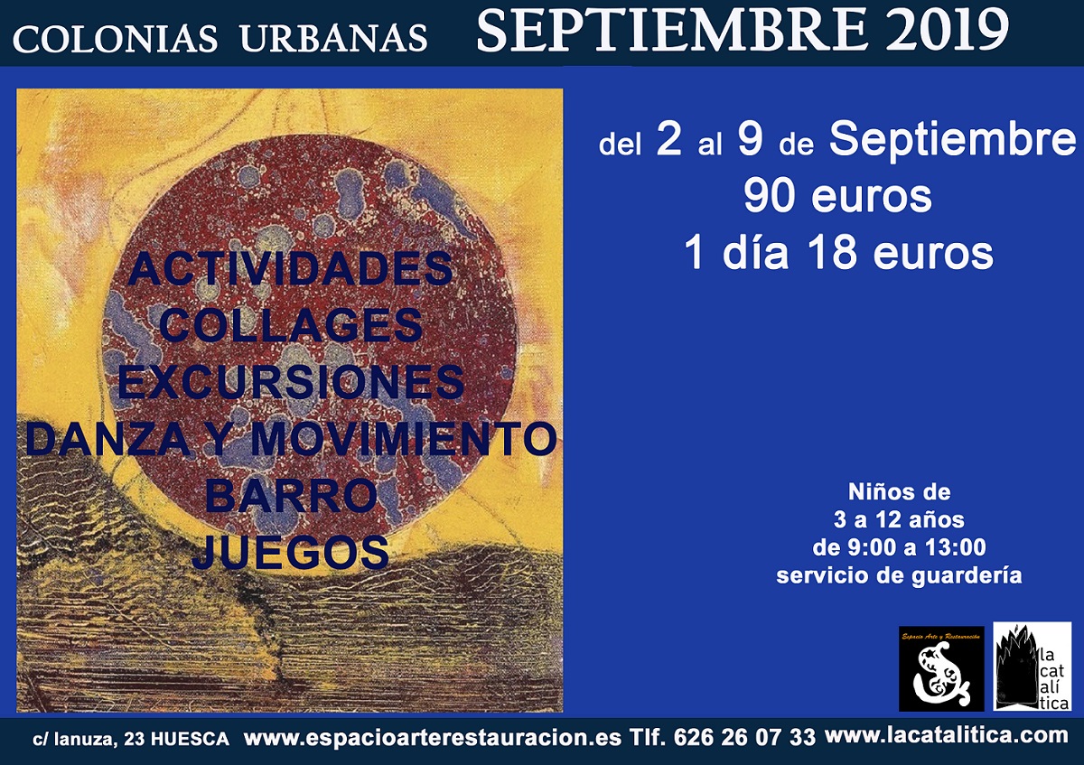 Desde Espacio Arte y Restauración, y en colaboración con La Catalítica os ofrecemos un campus urbano de arte durante los últimos días de las vacaciones de verano. Del 2 al 9 de septiembre, os esperamos en nuestros espacios de la Calle Lanuza de Huesca. Hemos preparado unas actividades enfocadas a niños y niñas entre 3 y 12 años, donde además de pasarlo bien, trataremos de introducir aspectos de conocimiento de una manera amena y divertida.