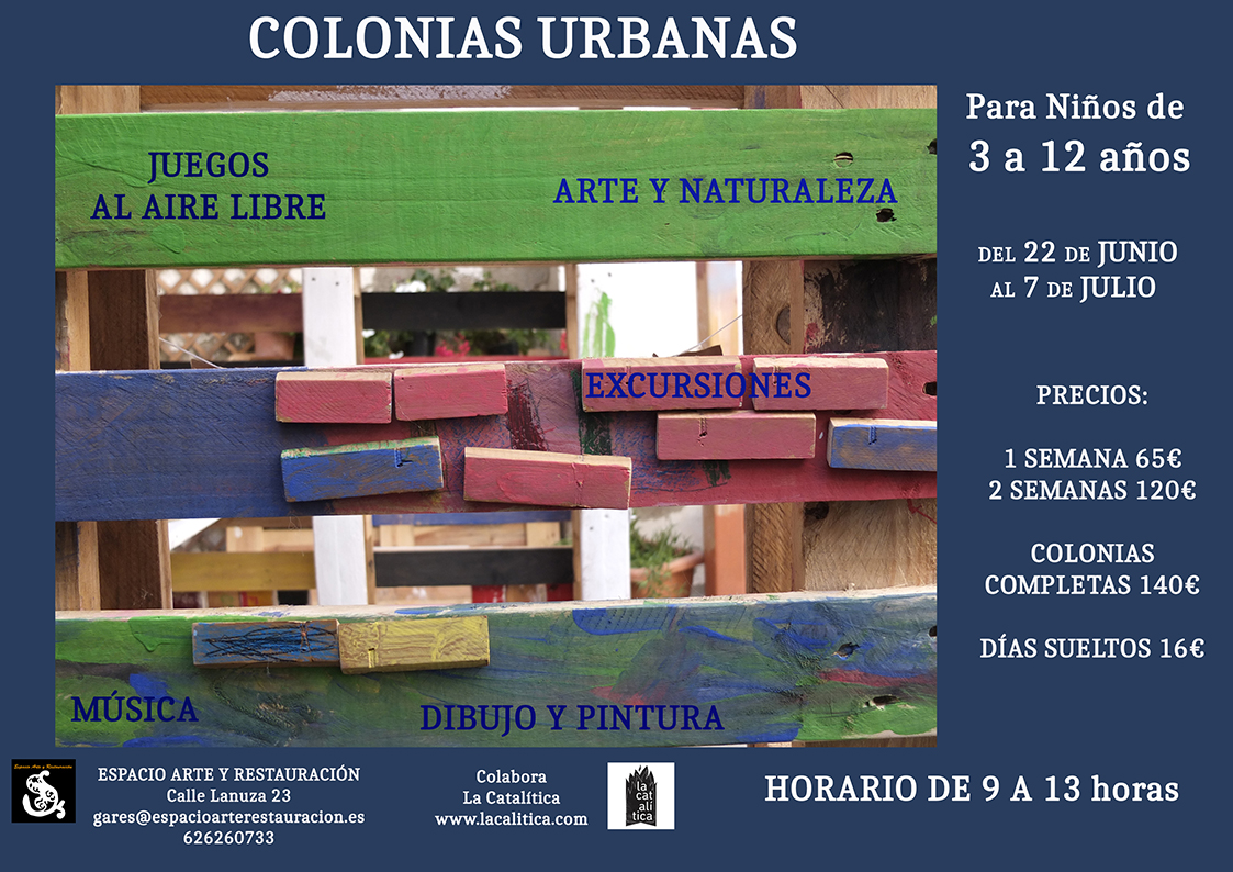 Desde Espacio Arte y Restauración, y en colaboración con La Catalítica os ofrecemos unas colonias urbanas de arte durante los primeros días de las vacaciones escolares. Del 22 de junio al 7 de julio, os esperamos en nuestros espacios de la Calle Lanuza de Huesca. Hemos preparado unas actividades enfocadas a niños y niñas entre 3 y 12 años, donde además de pasarlo bien, trataremos de introducir aspectos de aprendizaje de una manera amena y divertida.