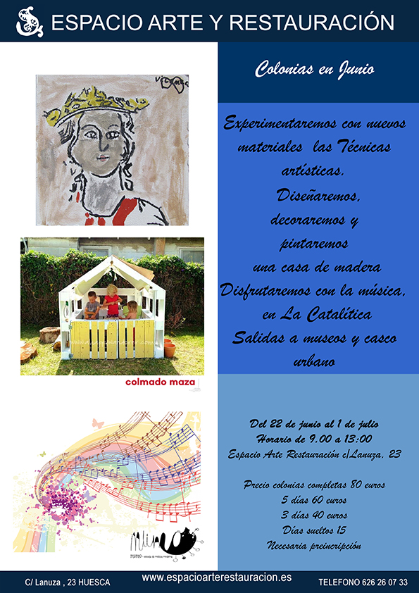 Desde Espacio Arte y Restauración queremos ofertaros unas colonias urbanas de arte durante los primeros días de las vacaciones de verano. Del 22 de junio al 1 de julio os esperamos en nuestro taller de la Calle Lanuza 23, de Huesca. Hemos preparado unas actividades enfocadas a niños y niñas entre 3 y 10 años.