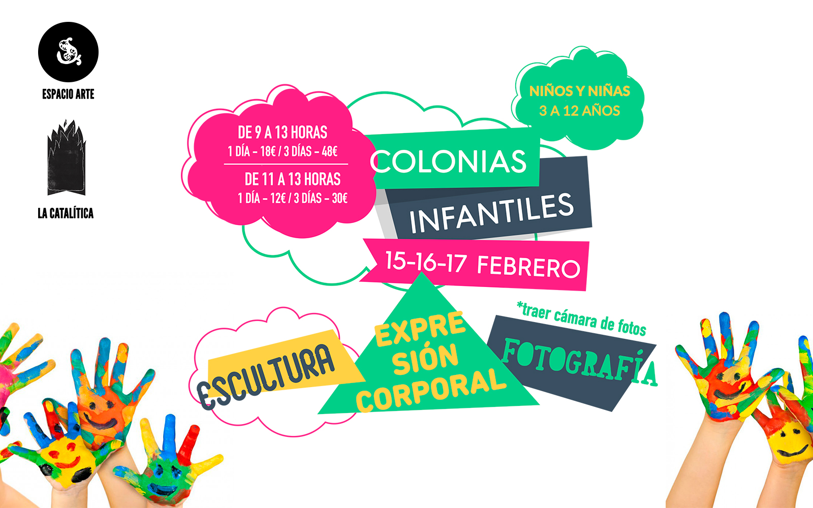 Desde Espacio Arte y Restauración, y en colaboración con La Catalítica os ofrecemos unas colonias urbanas de arte durante los días de la Semana Blanca. Del 15 al 17 de febrero os esperamos en nuestros espacios de la Calle Lanuza de Huesca. Hemos preparado unas actividades enfocadas a niños y niñas entre 3 y 12 años, donde además de pasarlo bien, trataremos de introducir aspectos de conocimiento de una manera amena y divertida.
